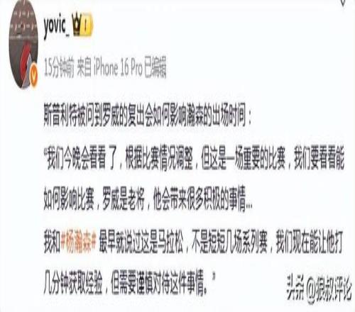 北京时间11月1日,NBA季中赛正式开打,开拓者对阵掘金,赛前,开拓者主帅斯普利特接受媒体采访,提到了罗威复出之后,杨瀚森位置变化等相关话题。