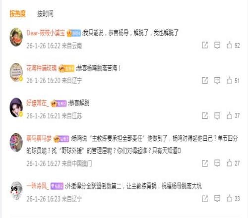 对于杨鸣如今主动请辞,辽篮官微下舆论普遍认为杨鸣解脱了: