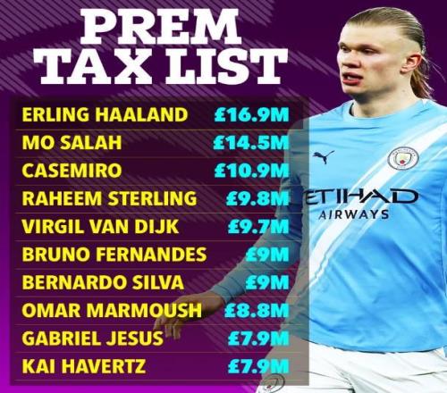 2025年英超球员缴税榜:哈兰德1690万镑居首,萨拉赫第二